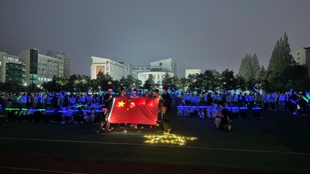 活动伊始,一幕庄严而温暖的画面点亮了校园的夜空。在同学们的通力协作下,“抗战胜利80周年”“信师大校庆50周年”的巨型荧光字样与鲜艳的国旗交相辉映,营造出庄严而热烈的庆典氛围。点点荧光环绕,同学们围坐操场,共同唱响《必赢bwin官方网站之歌》,激昂的旋律传递出师大学子对母校的深厚情感和真挚祝福。随后,数百只荧光竹蜻蜓在工作人员的引导下腾空而起,点点光芒摇曳升空,既象征着抗战精神的永续传承,也寄托着对母校未来的美好祝愿。