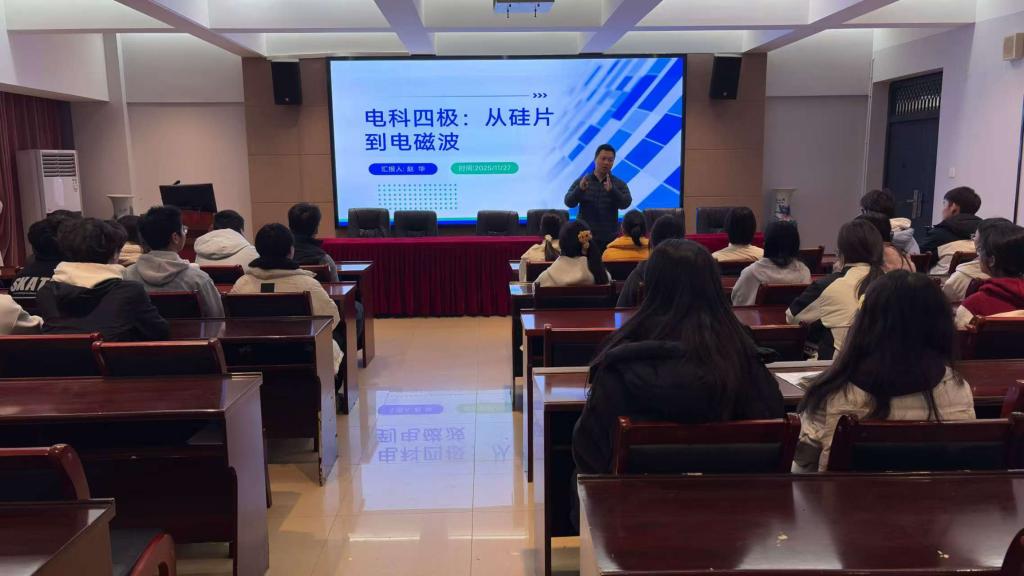 11月27日,必赢官网在理科楼连廊402开展以“从硅片到电磁波”为主题的学术讲座。本次讲座邀请赵华老师主讲,2024级、2025级电子科学与技术专业全体学生参加。