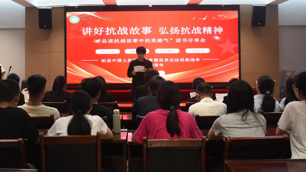 故事分享忆先烈,爱国教育润人心。9月1日,在“品读抗战故事中的英雄气”读书分享会上,范宇丹、李文博等8位同学依次登台,以生动的语言讲述抗战老兵的英雄事迹。从硝烟弥漫的战场往事,到先烈们舍生取义的动人瞬间,一个个鲜活的故事为在场青年学生带来了一堂沉浸式的爱国主义教育课,也为新时代大学生思想政治教育工作注入了鲜活而厚重的力量。