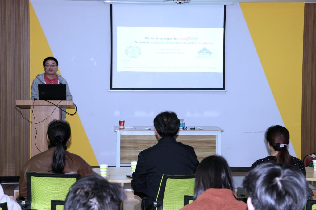 报告会上,张宏宝首先讲述了利用引力理论研究凝聚态物理的方法—AdS/CFT对偶,介绍了如何将这种对偶应用于研究冷原子物理中的超流现象,随后重点讲解了针对二维球面上的超流效应的最新研究成果。报告结束后,张宏宝教授与在场的师生展开了热烈的讨论,就师生们提出的问题进行了详细解答。